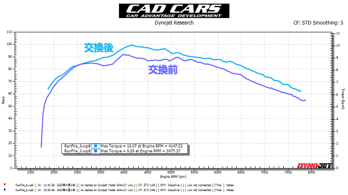 交換後は86.70ps/11.58kgmと約10%向上し、さらに大型コアおよび配管サイズ拡大にもかかわらずレスポンスの悪化は全くありませんでした。