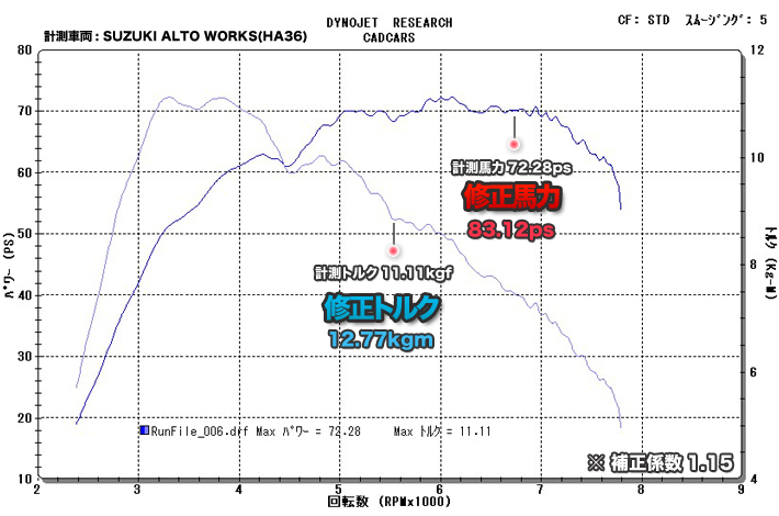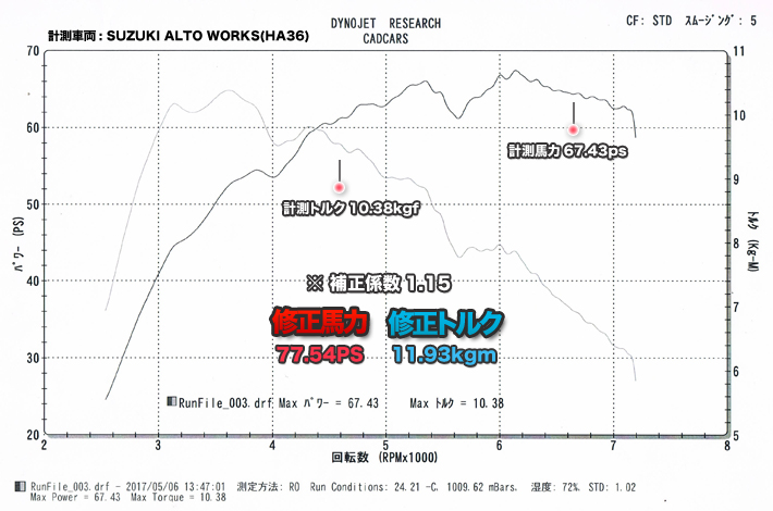 パワーグラフ計測時の車両 ・計測車両:SUZUKI ALTO WORKS(HA36) 装着パーツ ・D.T.Mオリジナル タービンチューン極(TYPE-A) ・D.T.Mオリジナル HA36用 スポーツECU ・D.T.Mオリジナル スーパーエアチャージャー ・D.T.Mオリジナル エアインテーク ・D.T.Mオリジナルハイフロースポーツマフラー